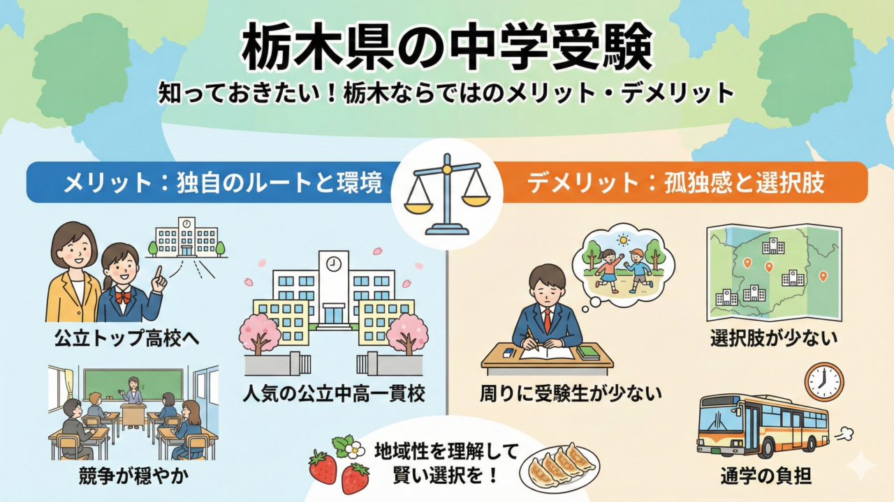 今回は、栃木県の中学受験における「栃木ならでは」のメリットとデメリットを図解とともに詳しく解説します。お子様にとって最良の選択をするためのヒントになれば幸いです。